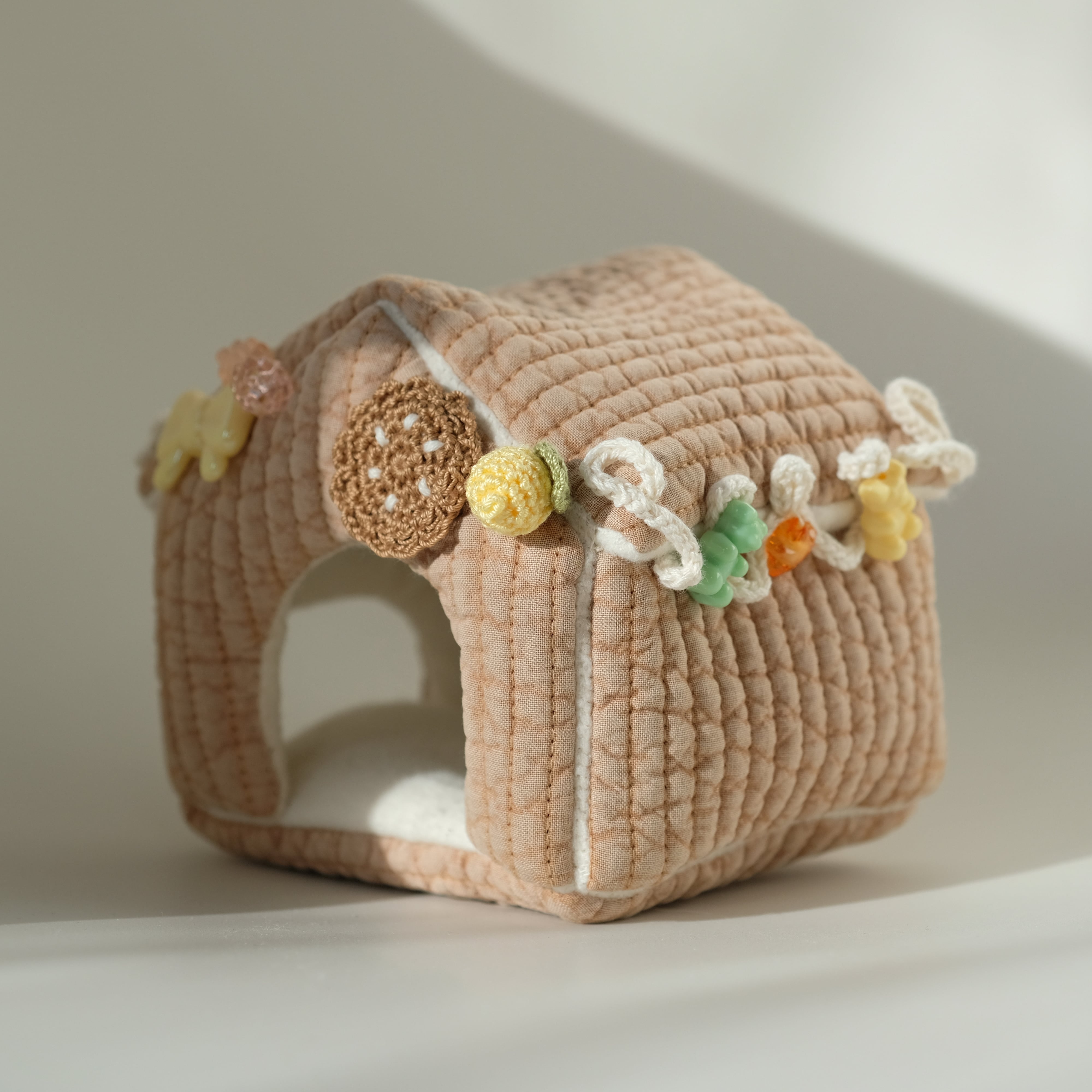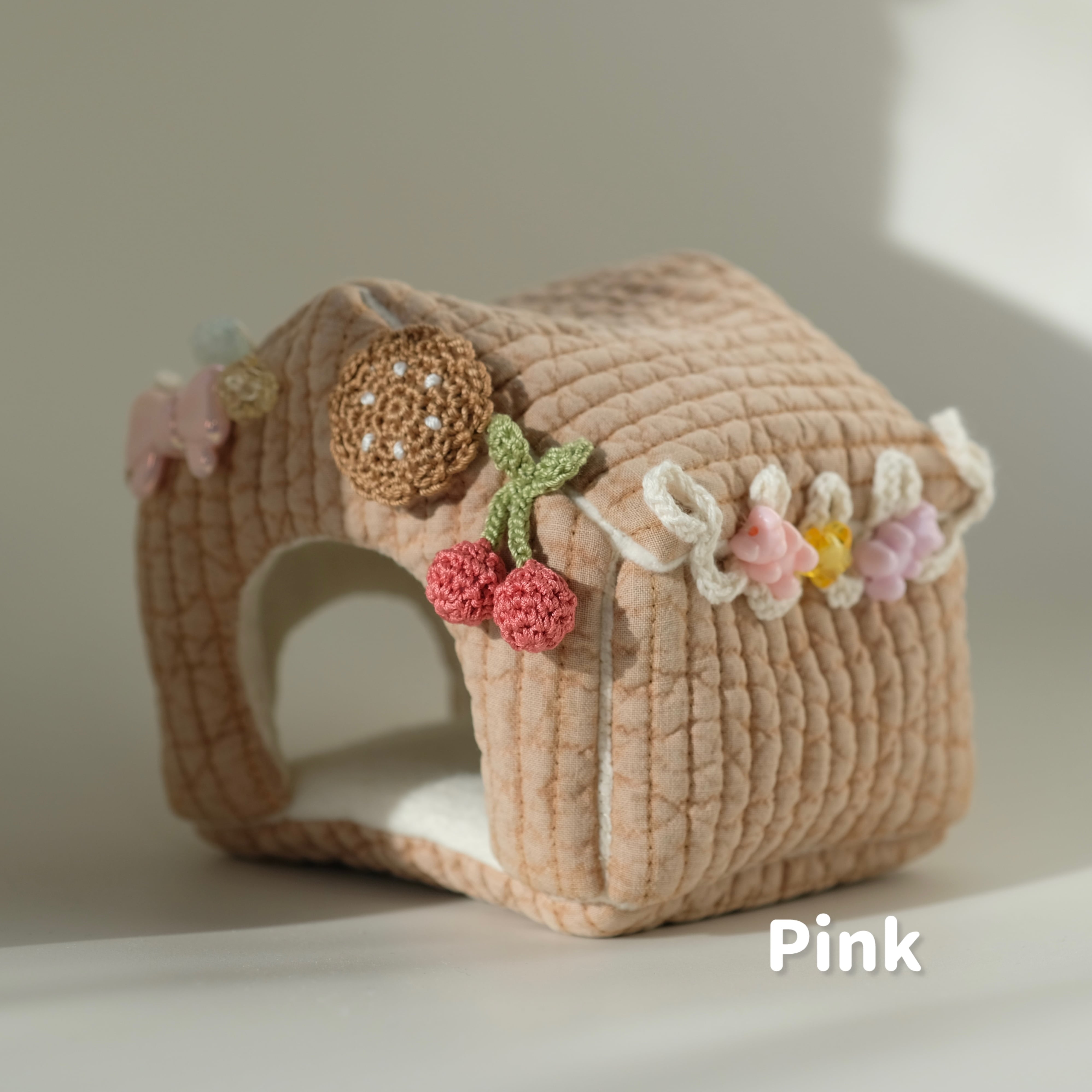 中に入ってくつろいだり、屋根を内側から突いたり、上に乗ったり、手編みの果実やおもちゃを引っ張ったり…