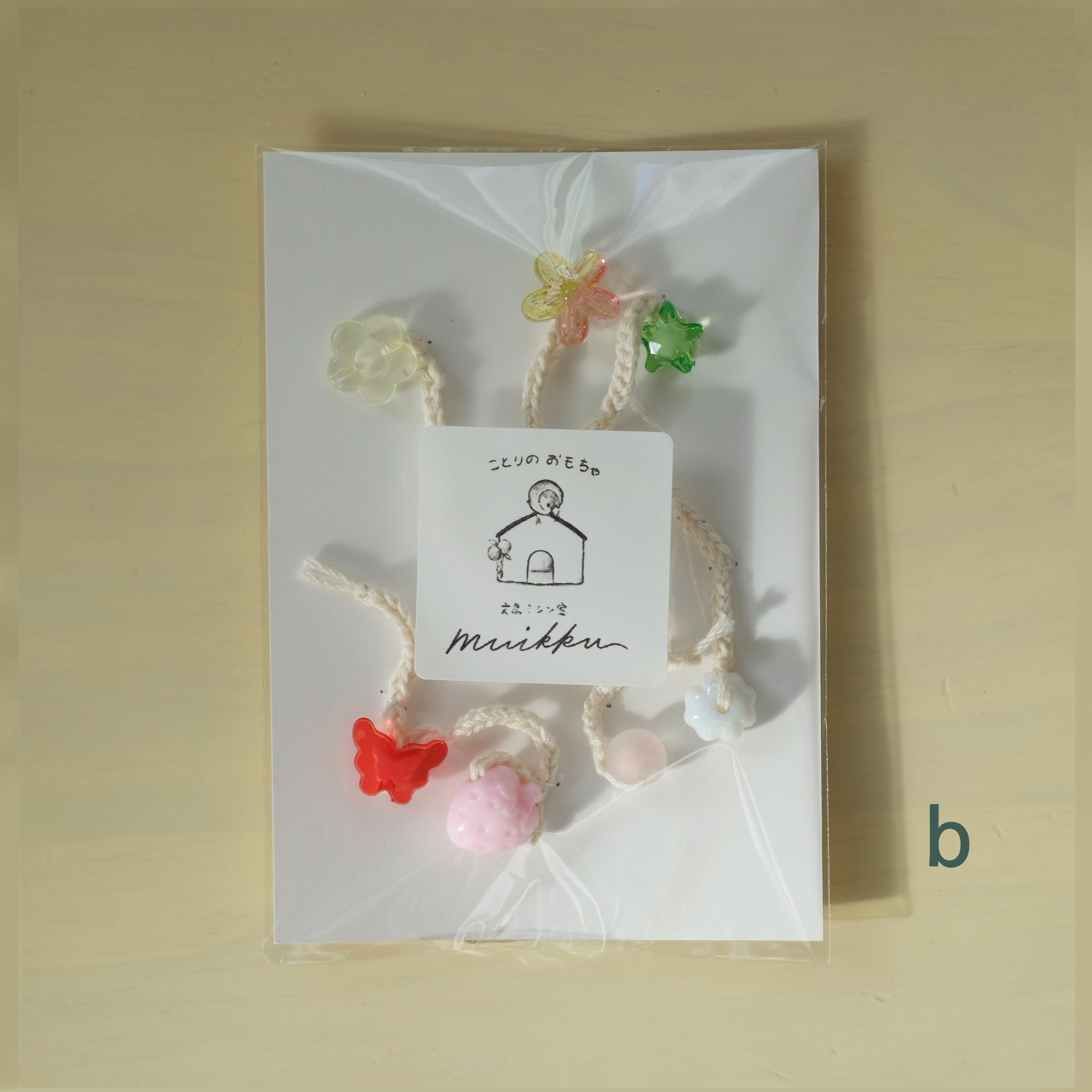 手編み紐がついているので、文鳥さんの嘴でもチョイッと摘んで放り投げたり、